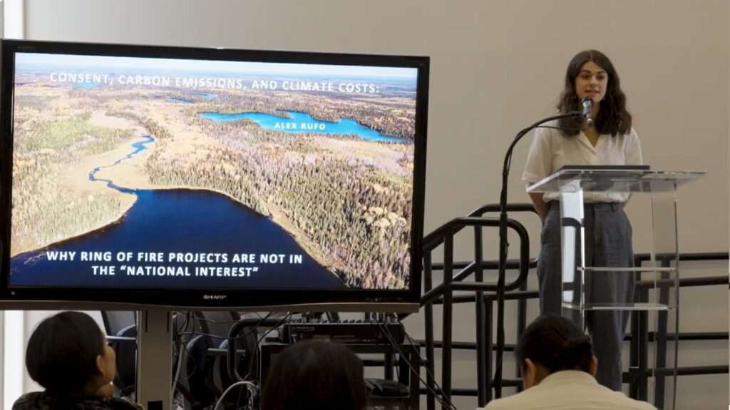 On March 5, 2026, the Environmental Justice and Sustainability Clinic at Osgoode Hall Law School hosted a student research symposium, “What’s Actually Happening in the Ring of Fire?” This event brought together law students and land defenders from Neskantaga First Nation, Attawapiskat First Nation, and 8th Fire Rising to make sense of the rapidly changing regulatory landscape across the Indigenous homelands of Treaty No. 9. Leaders, land defenders, and community members from Neskantaga First Nation and Attawapiskat First Nation described the Here We Stand camp they have set up on the Attawapiskat River (at the proposed crossing site for the mining road) and their ongoing land defence actions.